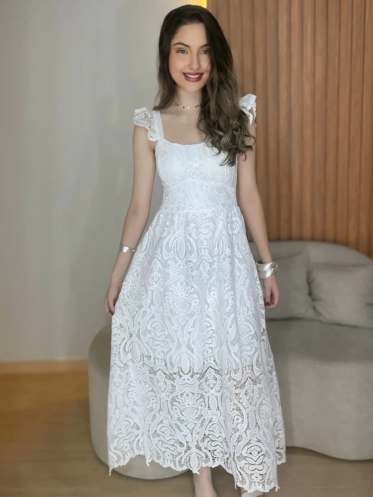 O Vestido Longo Helena da Maria Maite é feito em renda branca delicada, com caimento fluido e toque romântico que transforma qualquer momento em algo especial. A modelagem valoriza o corpo com suavidade, criando um visual feminino, leve e inesquecível.