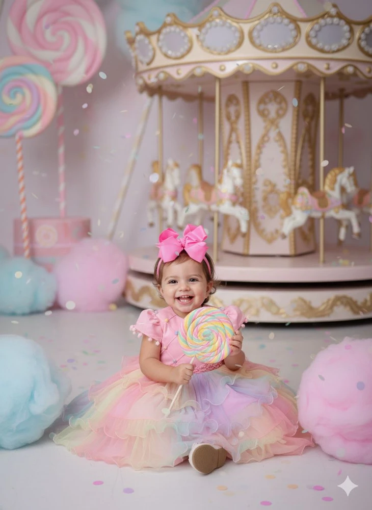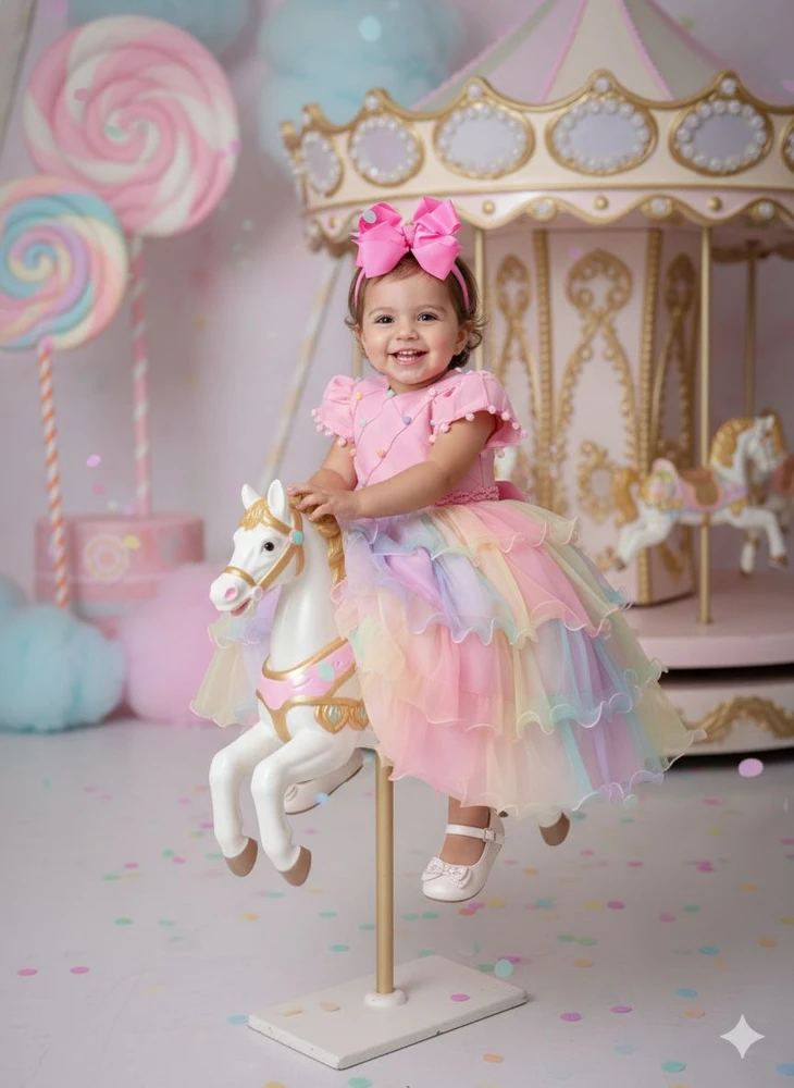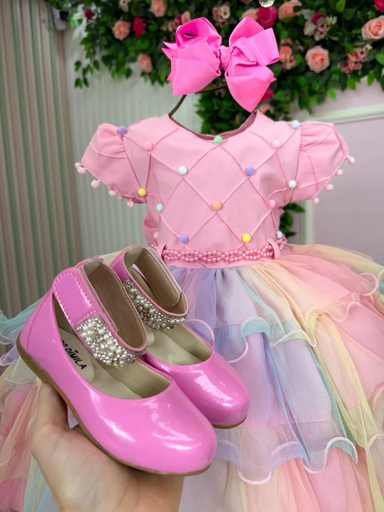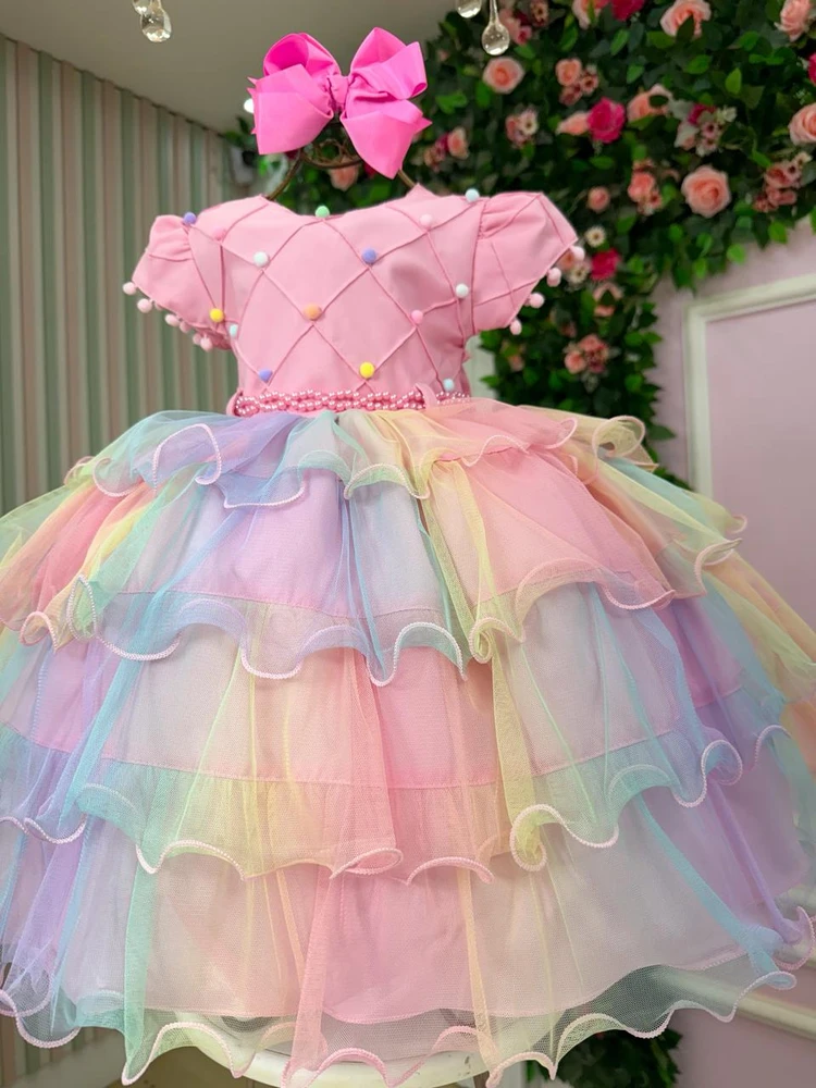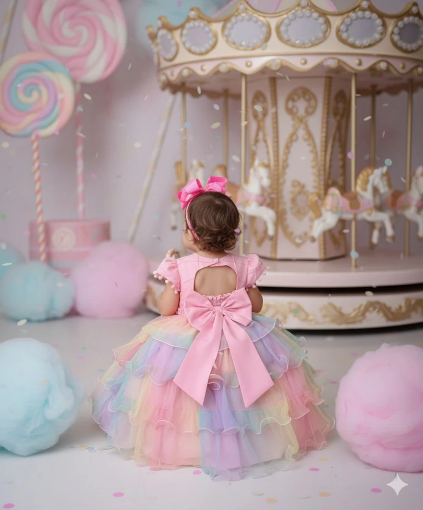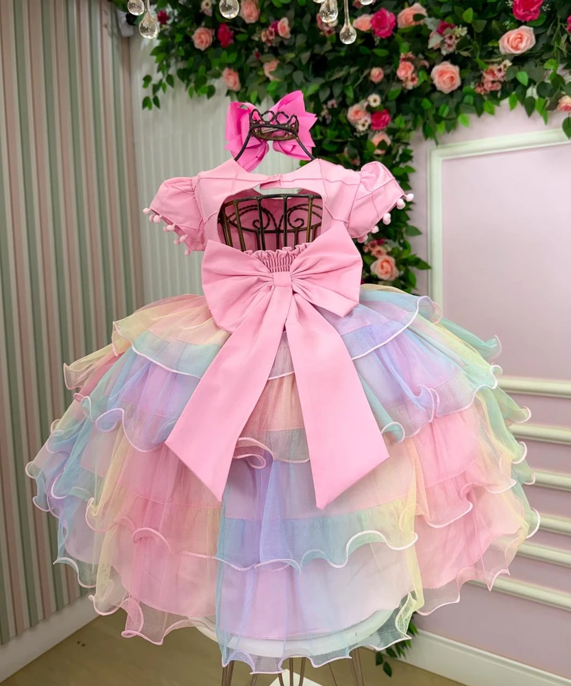 Vestido Aurora – Um arco-íris de encanto em cada camada! Um modelo que parece ter sido retirado direto de um sonho açucarado. O Vestido Aurora é perfeito para quem ama cor, leveza e aquele toque mágico que transforma qualquer festa em um espetáculo.Com sua paleta candy super suave e a saia em camadas de tule multicolorido, ele combina com vários temas infantis, criando um visual cheio de fantasia e alegria.Detalhes que fazem brilhar:• Busto matelassado com aplicação de bolinhas coloridas, deixando tudo ainda mais lúdico• Manguinhas fofas com pompons delicados• Cintura bordada em pérolas rosadas para um charme extra• Temas perfeitos para usar o Aurora:Chuva de Benção, Chuva de Amores, Circo, Candy, Doceria, Tie Dye, Unicórnio, Arco Iris e Fest Colors, Colorido. Informações Importantes As medidas podem variar em até 2cm. Recomendamos sempre consultar a tabela de medidas antes da compra para evitar erros. Tecido 100% poliesterPara um volume extra, indicamos o uso de saiote de armação, vendido separadamente na categoria Acessórios.Tiara e outros acessórios não acompanham o produto, mas estão disponíveis em nosso site.Calçado vendido separadamente, disponível na categoria CalçadosAs cores do produto podem sofrer variações de tonalidade conforme a configuração da tela do seu dispositivo.