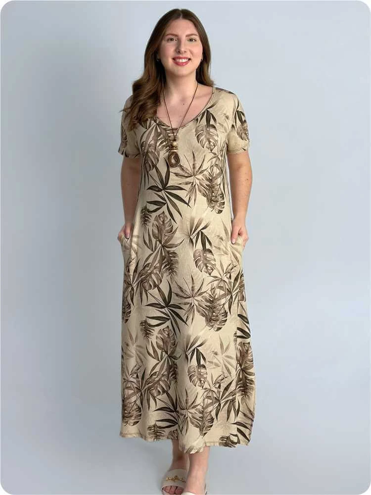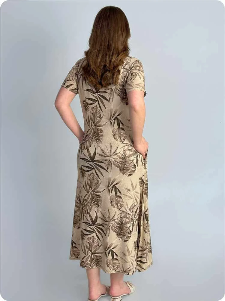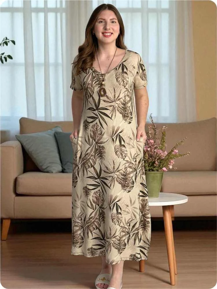 O Vestido Midi Bege Estampado Malha Soltinha Com Manguinha da Mariantonia é a personificação da elegância descomplicada e do conforto para o dia a dia. Confeccionado em malha leve e macia, este vestido apresenta uma modelagem soltinha que se adapta harmoniosamente a todos os biotipos, garantindo liberdade de movimento e bem-estar em qualquer ocasião.