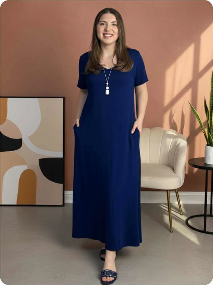 Descubra o equilíbrio perfeito entre elegância e praticidade com este vestido midi feminino azul, feito em malha macia e com modelagem fluida que valoriza todos os tipos de corpo. A gola V alonga a silhueta, enquanto as mangas curtas garantem frescor e liberdade de movimento. Ideal para diversas ocasiões, do trabalho ao lazer, o vestido conta com bolsos laterais funcionais, unindo charme à utilidade.