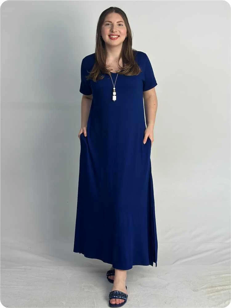 Vestido Midi Feminino Azul Malha Gola V, com bolsos e fenda nas laterais
