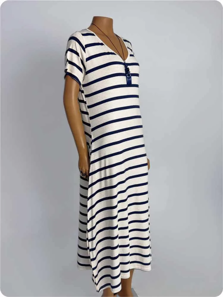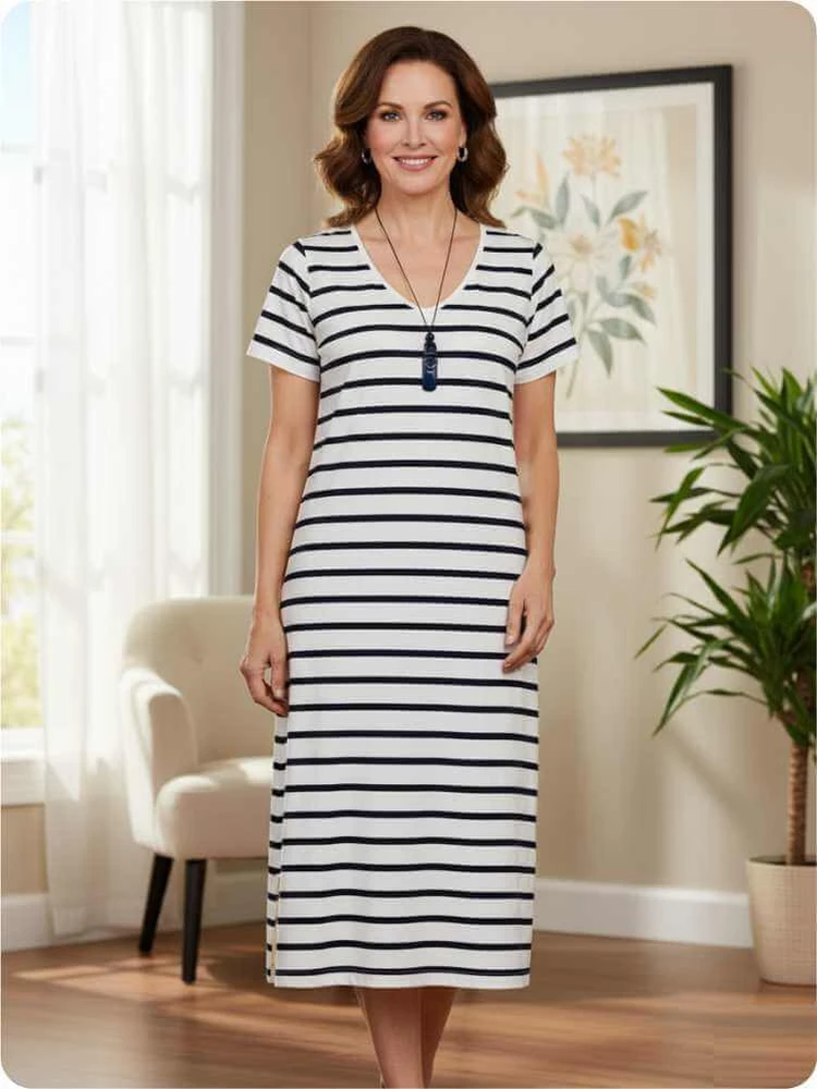 Descubra o conforto e a elegância do vestido midi listrado em malha, perfeito para mulheres que buscam estilo aliado à praticidade no dia a dia. Com design soltinho e gola V, ele valoriza a silhueta sem apertar, proporcionando liberdade de movimento e frescor para diversas ocasiões.