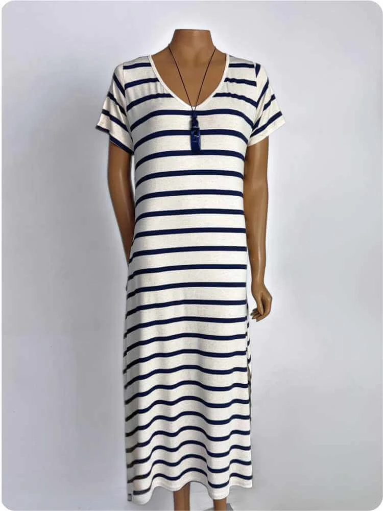 Vestido Midi Feminino Listrado Malha Soltinha Gola V, com bolsos e fenda nas laterais