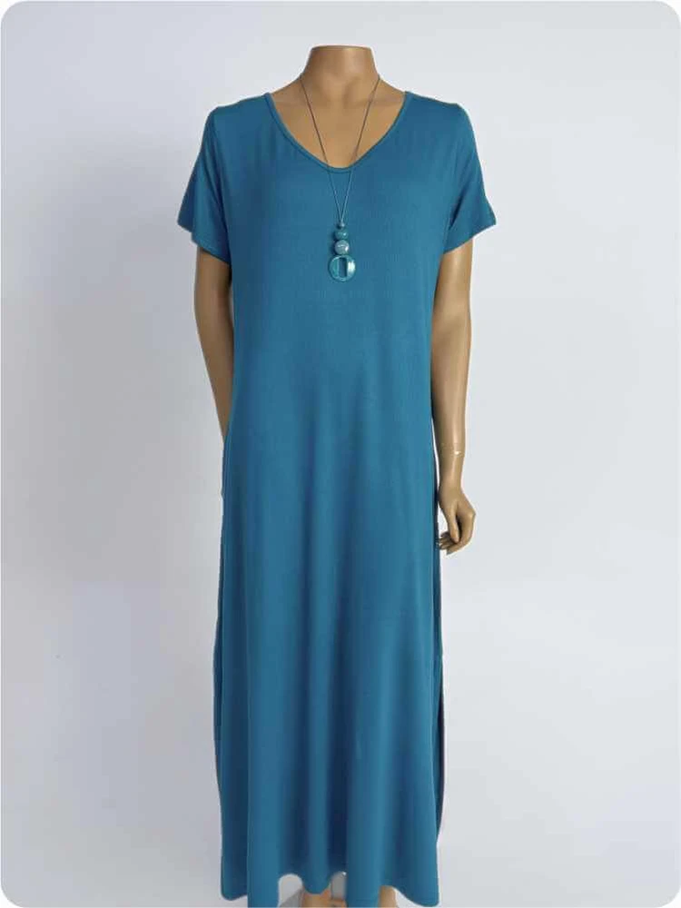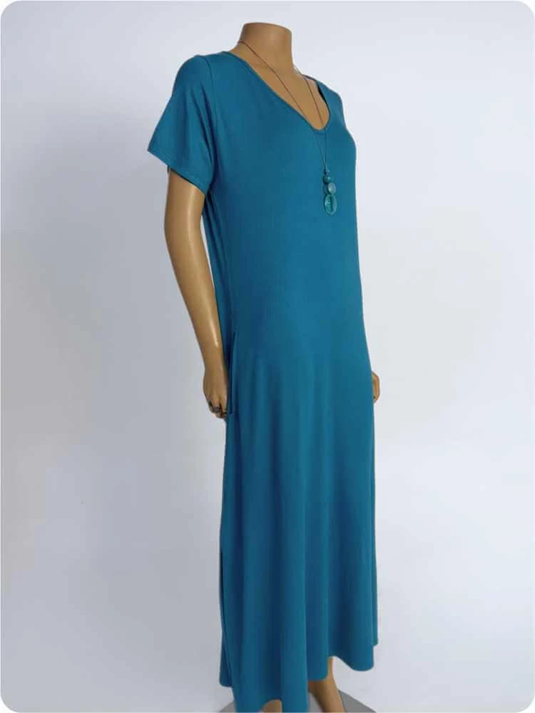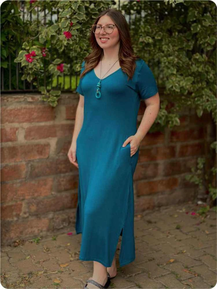 Vestido Midi Feminino Verde Petróleo Malha Gola V, com bolsos e fenda nas laterais