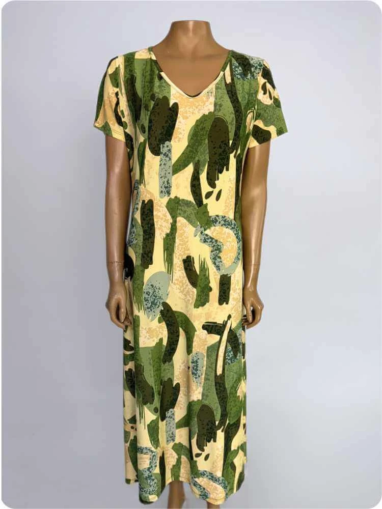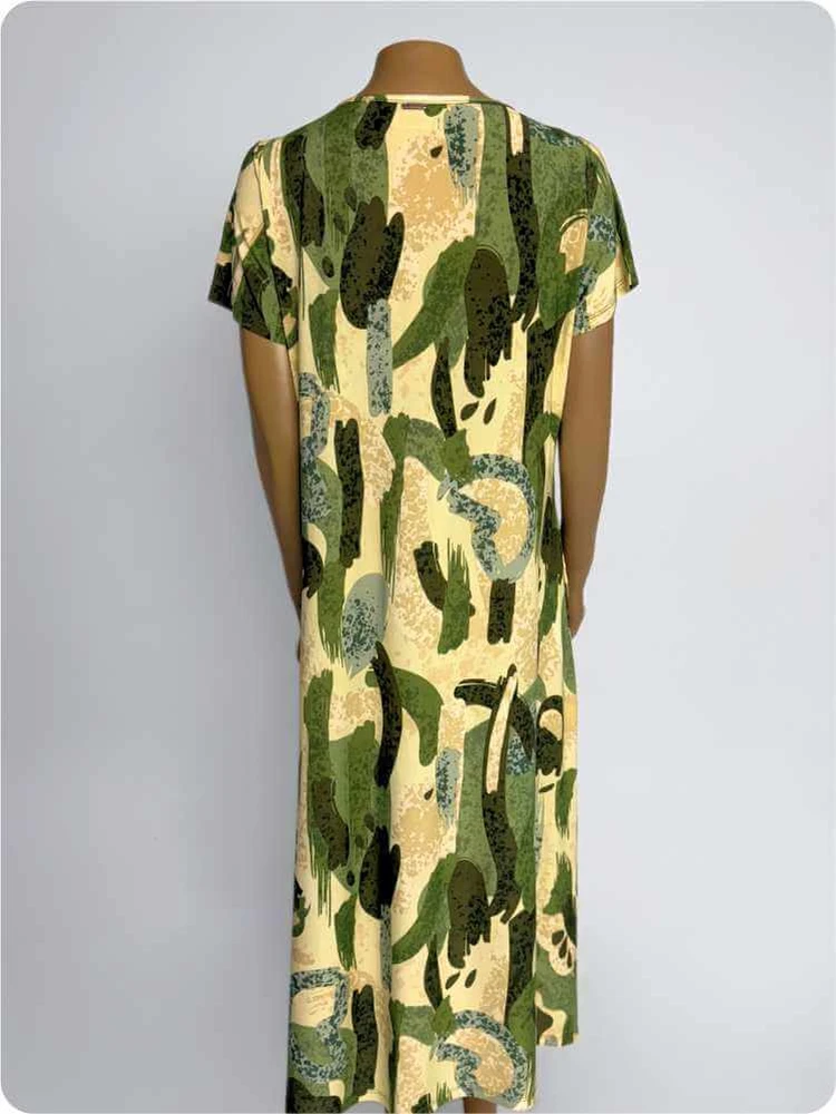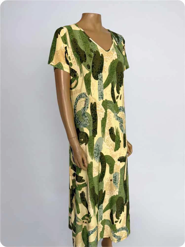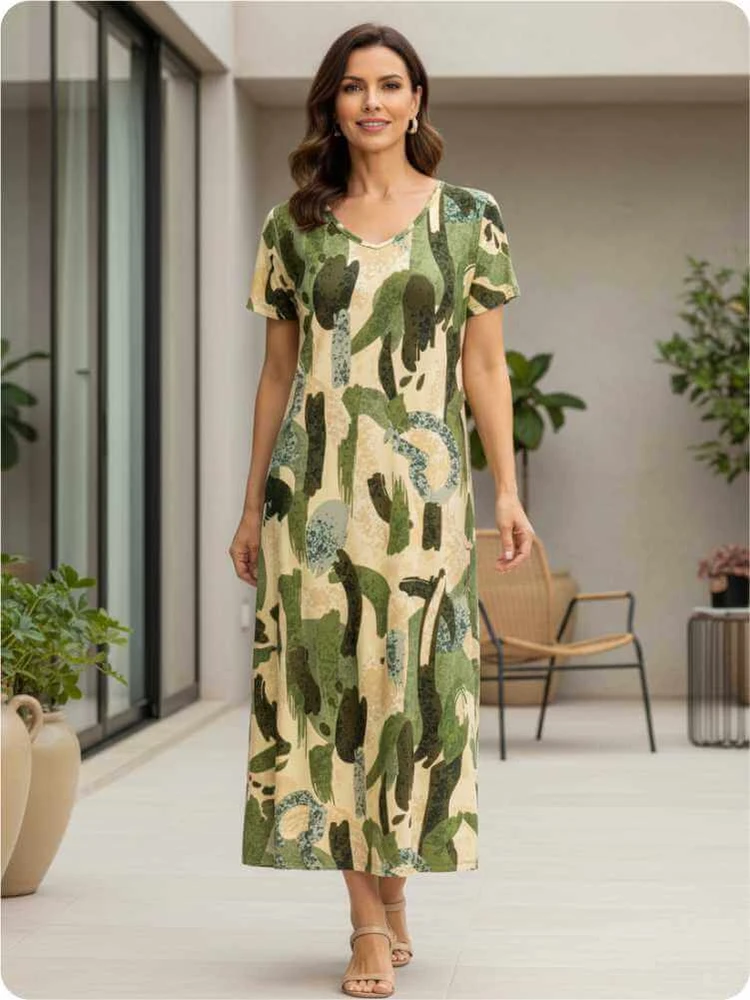 A escolha perfeita para quem busca conforto e estilo em dias quentes. Seu tecido geladinho proporciona frescor e toque suave na pele, ideal para o clima tropical. A estampa exclusiva em tons de verde traz um visual moderno e natural, que valoriza qualquer ocasião, do passeio casual ao encontro entre amigos. O corte midi com manguinhas oferece liberdade de movimento e caimento fluido, garantindo elegância sem abrir mão da praticidade. Além de realçar a silhueta, esse vestido é versátil e fácil de combinar, tornando-se um item essencial no guarda-roupa.