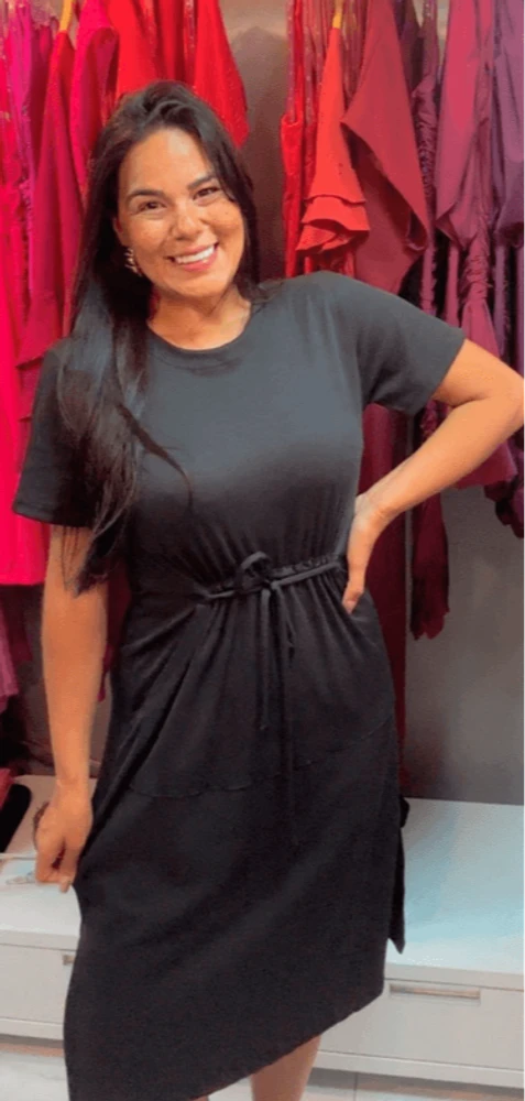 O clássico indispensável ganha uma versão moderna e ultra confortável. Este vestido preto é aquela peça "tem que ter" no guarda-roupa, projetada para transitar do ambiente de trabalho ao happy hour com facilidade.