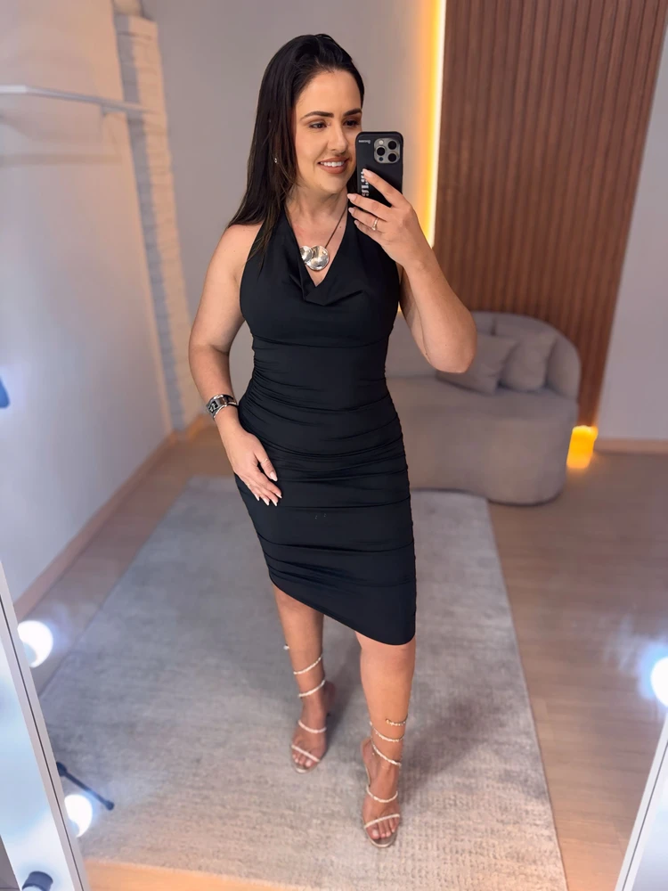 O Vestido Noite Bella é puro poder e elegância! Com um decote profundo que valoriza o colo e drapeados laterais que destacam as curvas com charme, ele é ideal para ocasiões especiais onde o look precisa impressionar.