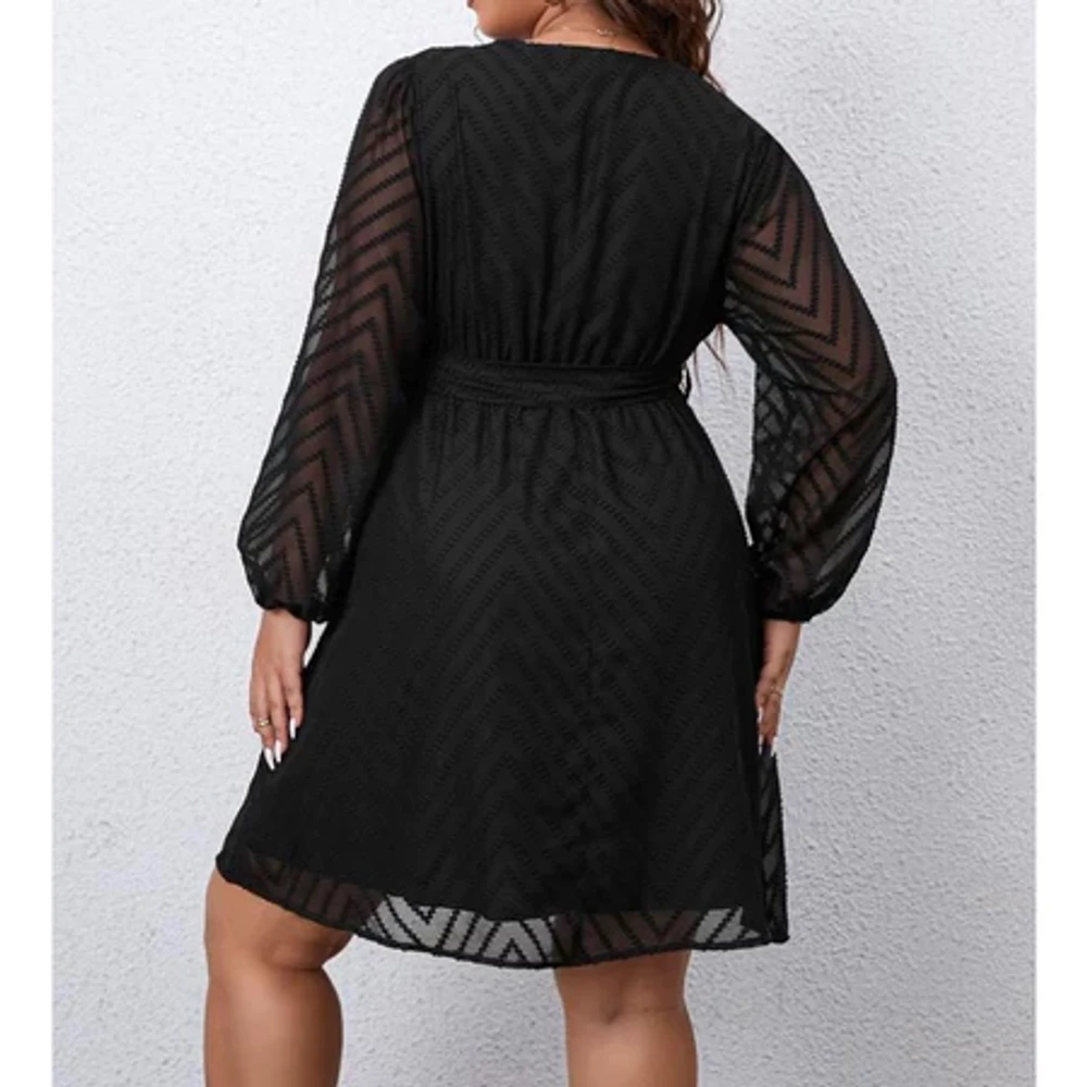 Vestido Plus Size Curto Manga Longa Tule Texturizado Elegante Preto SH D511