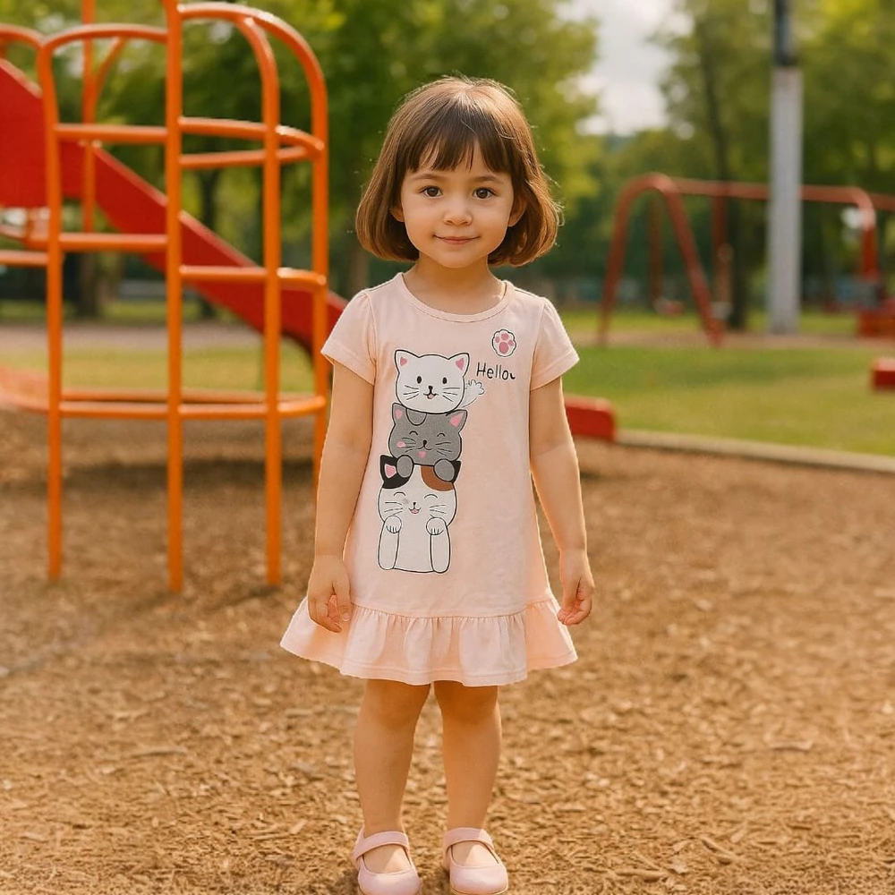 Vestido rosa claro infantil com estampa divertida de gatinhos, perfeito para meninas cheias de vida e estilo. Confeccionado em tecido leve e macio, proporciona conforto durante todo o dia, ideal para brincar no parque ou passeios ao ar livre. Seu design com babado na barra oferece um toque delicado e feminino, valorizando a liberdade de movimento. A estampa exclusiva "Hellow" acrescenta personalidade, conquistando o carinho das pequenas.