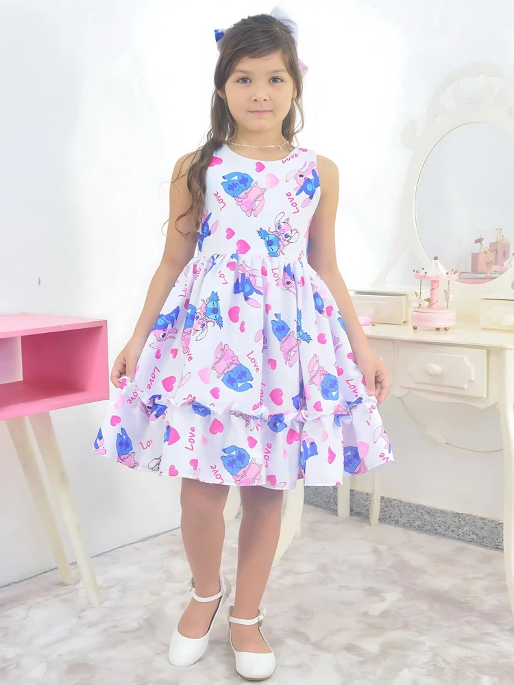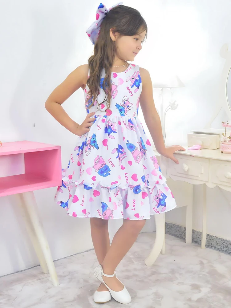 Transforme passeios, festas e comemorações em momentos ainda mais especiais com o encantador Vestido Infantil Stitch e Angel. O modelo une o charme dos babados rodados com uma estampa divertida dos personagens mais queridos, criando um visual único, cheio de estilo e personalidade para crianças que adoram se destacar.