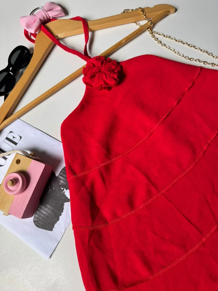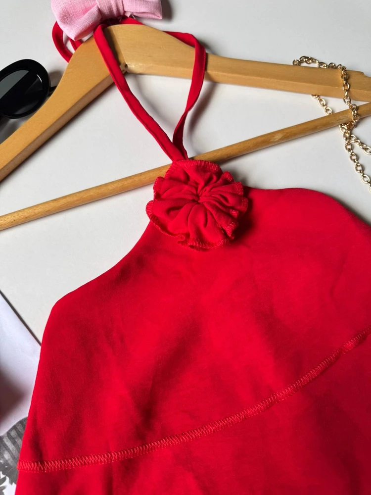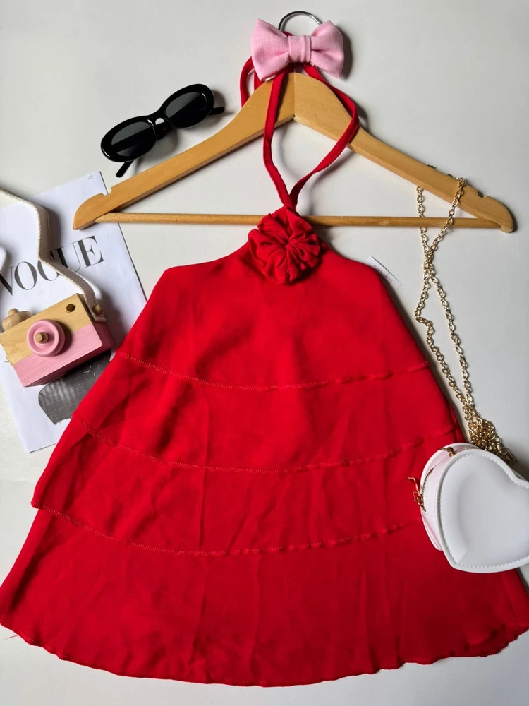 O vestido possui um design clássico e atemporal, com detalhe de Flor e amarração no pescoço que estão super em alta, além de ter os babados que dão um ar de princesa para a sua pequena. Além disso, o tom vermelho vibrante traz um toque de cor e alegria para o look, deixando sua filha ainda mais encantadora.