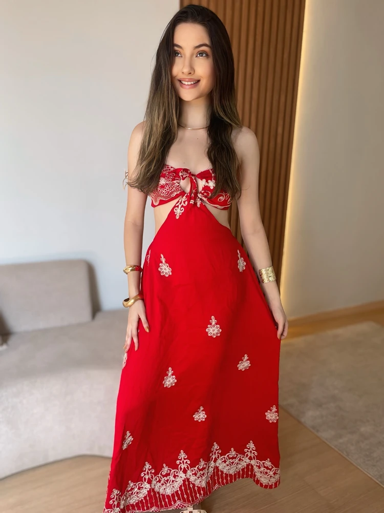 O Vestido Vitória é uma peça longa e fluida, com bordados florais delicados que trazem um ar artesanal, sofisticado e feminino. Acompanha um top estilo ciganinha com lastex nas costas, garantindo conforto e caimento perfeito.