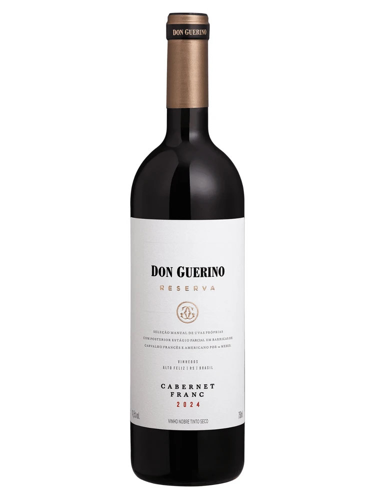 O vinho tinto Don Guerino Reserva Cabernet Franc, é produzido pela Vinícola Don Guerino. Uma vinícola familiar, que está localizada na cidade de Alto Feliz - RS. localizada no paralelo 29° Sul, com terroir caracterizado por uma constante exposição solar e ventilação. Elaborado a partir da uva Cabernet Franc, de vinhedos próprios localizados na Serra Gaúcha - RS. Passagem de 20% do vinho por 12 meses em barricas de carvalho francês e americano. Coloração vermelha com reflexos violáceos, apresentando aromas de cerejas, amoras, chocolate, especiarias e menta. Em boca é potente, com taninos envolventes e maduros.
