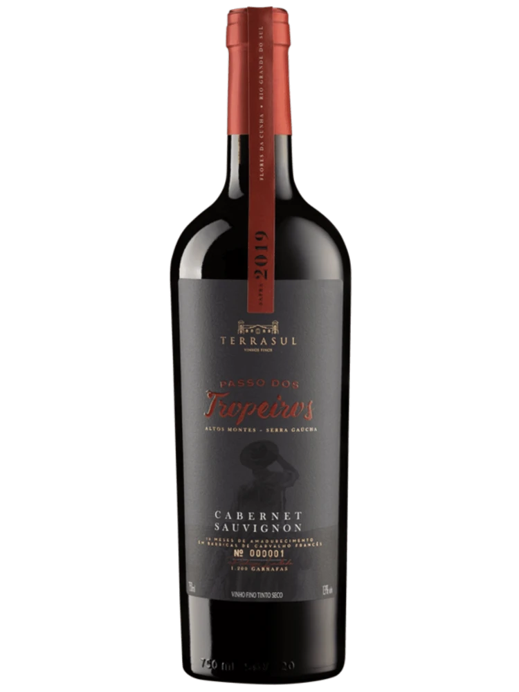 O vinho Terrasul Passo dos Tropeiros Cabernet Sauvignon é produzido pela Terrasul Vinhos Finos. Uma vinícola boutique da região dos Altos Montes-RS. Sua produção é de lotes exclusivos e limitados, o que confere aos seus vinhos extrema qualidade e autenticidade. É um vinho reserva, de extrema qualidade elaborado com 100% de uvas Cabernet Sauvignon produzidas na região da Serra do Sudeste-RS. Sua maturação por 12 meses em barris de carvalho, conferiu a este vinho complexidade aromática com destaque para as especiarias. De coloração vermelho rubi intenso. Nos aromas,