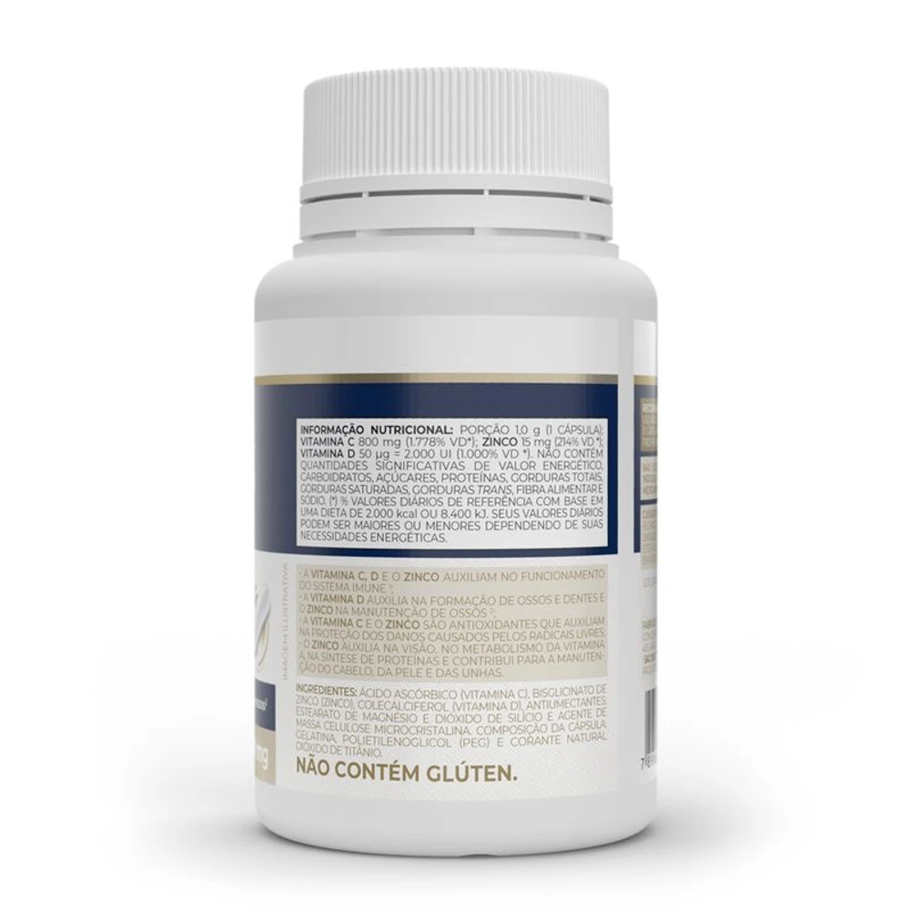 Ácido ascórbico (vitamina C), bisglicinato de zinco (zinco), colecalciferol (vitamina D), antiumectantes: estearato de magnésio e dióxido de silício e agente de massa celulose microcristalina. Composição da cápsula: gelatina, polietilenoglicol (PEG) e corante natural dióxido de titânio.