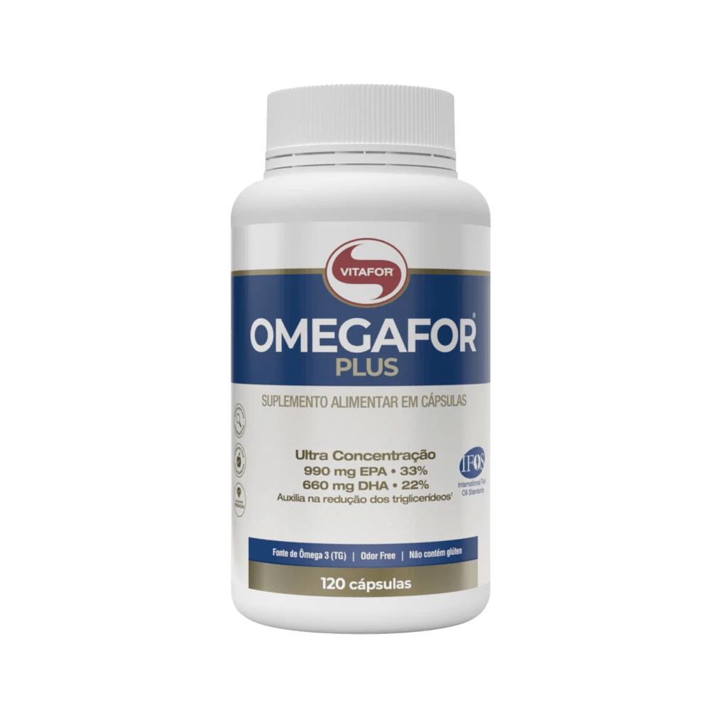 Omegafor Plus 1000 mg. 120 Caps.O Ômegafor Plus é um suplemento alimentar à base de óleo de peixe rico em ômega-3. Possui alta concentração de seus derivados, ácido eicosapentaenoico (EPA) - 990mg e ácido docosahexaeoico (DHA) - 660mg.Apresentação:Embalagem com 120 cápsulas.BenefíciosAlegação de propriedade funcional aprovada:O consumo de ácidos graxos ômega 3 auxilia na manutenção de níveis saudáveis de triglicerídeos, desde que associado a uma alimentação equilibrada e hábitos de vida saudáveisÔmega 3 com 33% de EPA (ácido eicosapentaenoico) e 22% de DHA (ácido docosahexaeoico)DiferenciaisÓleo de peixe extraído de peixes de águas frias e profundas.Possui alta concentração dos derivados de ômega-3: 990mg de ácido eicosapentaenóico (EPA) e 660mg de ácidodocosahexaenóico (DHA), substâncias que conferem benefícios ao organismo.Certificação IFOS (InternationalFishOil Standards Program)que garante a isenção de metais pesados que, em excesso,podem ser tóxicos à saúde.RECOMENDAÇÃO DE USOIngerir 1 cápsula, 3 vezes ao dia, preferencialmente 30 minutos antes das principais refeições.MS. 6.5426.0016.001-7