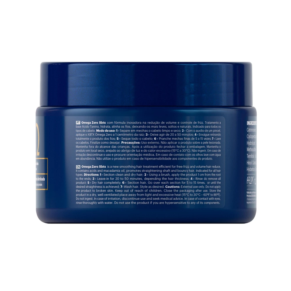 XBTX Ômega Zero possui fórmula inovadora na redução de volume e controle de frizz. Tratamento a base Ácido Tanino, hidrata, alinha os fios, deixando-os mais leves, soltos e naturais. Indicado para todos os tipos de cabelo.